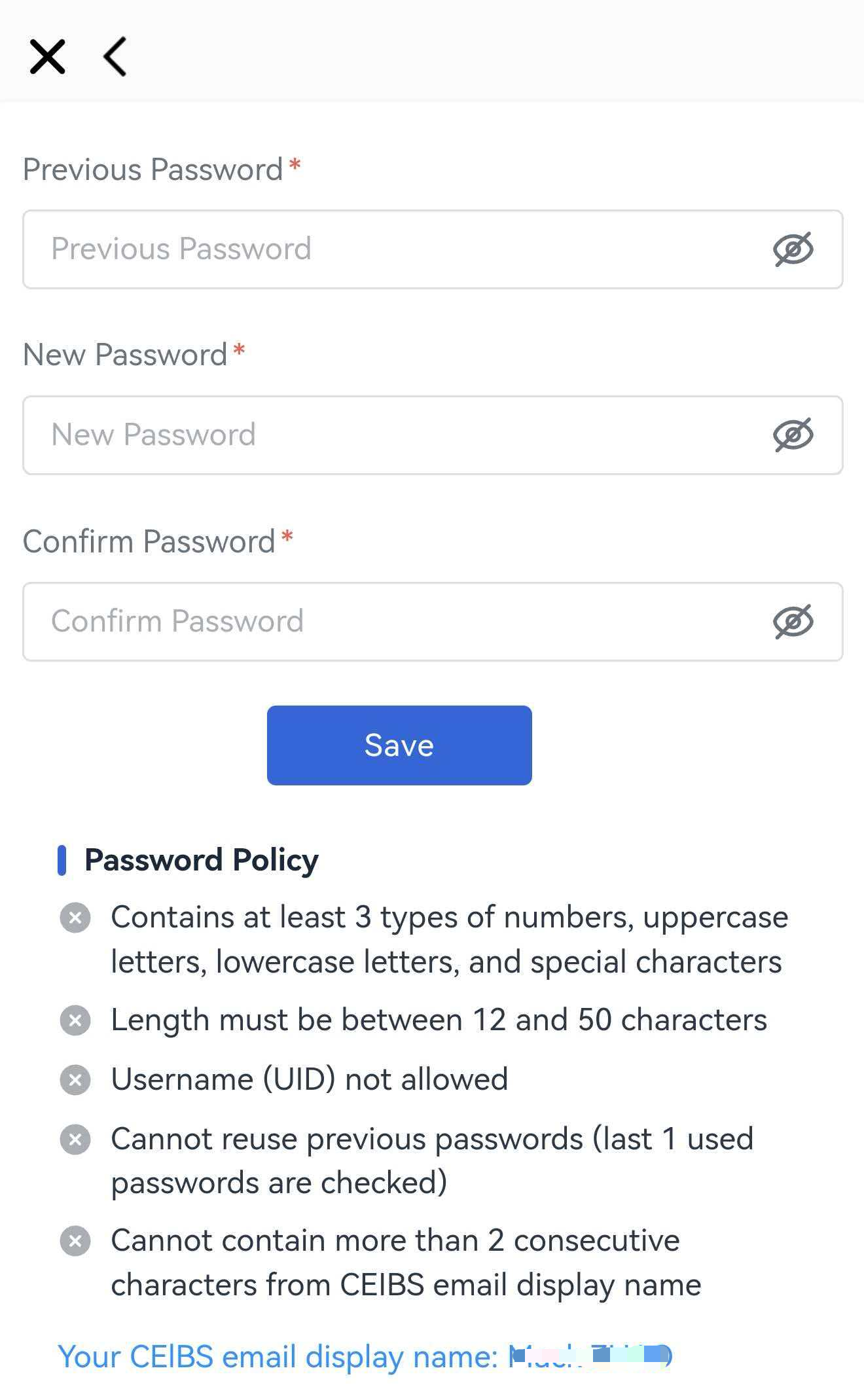 - Enter your Previous Password, then follow the Password Policy and enter your New Password and Confirm Password, then tap Save.