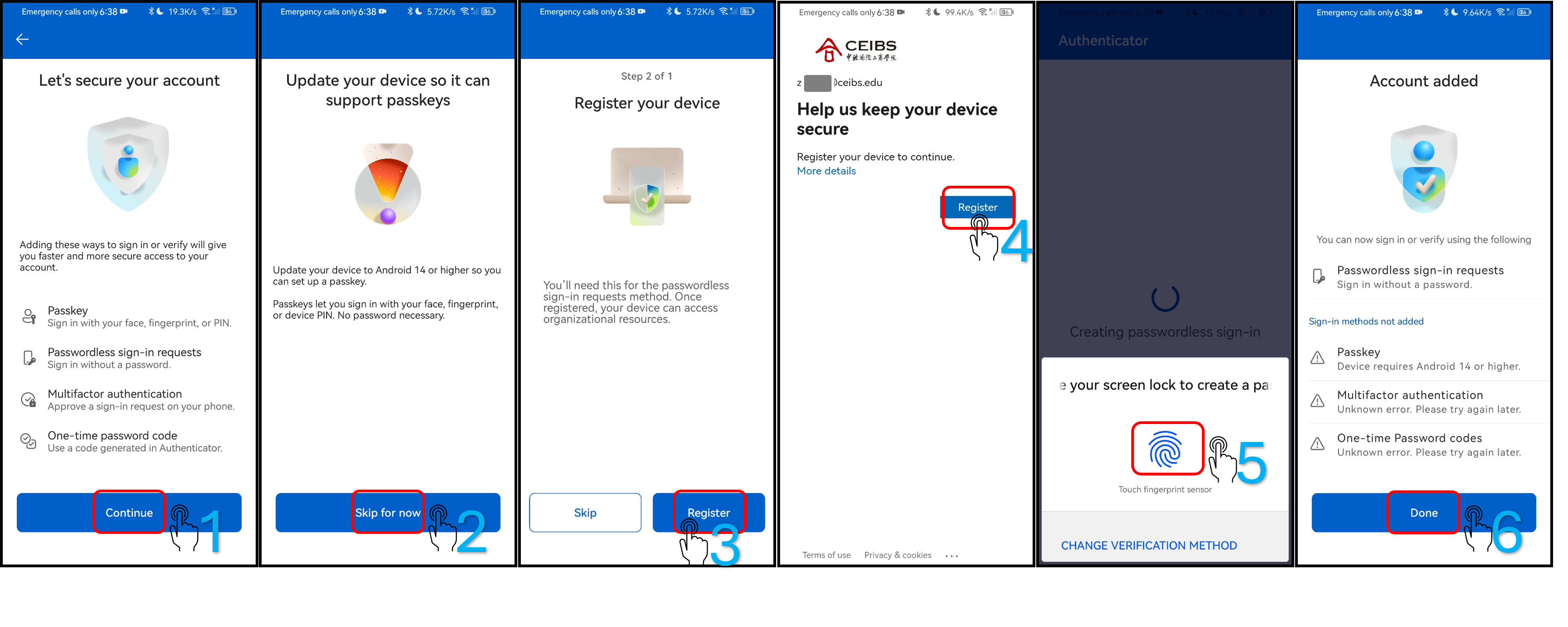 3. Tap “Continue” to add these ways to sign in -> tap “Skip for now” for passkey way -> tap “Register” for device -> tap “Register” in redirect page -> use your screen lock method to verify(Passcode or Fingerprint) -> tap “Done” to complete process.