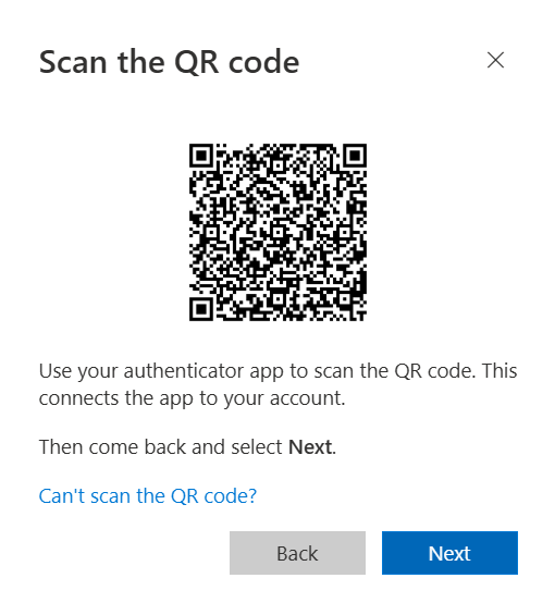 - On your mobile phone, open Microsoft Authenticator and tap Add Account -> Work or school account -> Scan QR code, then scan the QR code from the previous step.