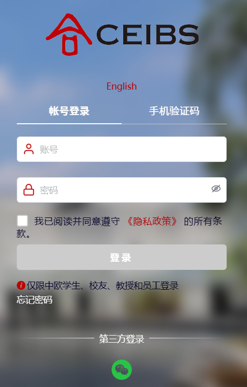 首先,访问 中欧主页https://www.ceibs.edu/,点击右上角的快速登录,选择中欧一站式服务大厅(直达链接:https://icampus.ceibs.edu),如您之前已登录,需先退出登录账户,来到登录界面。