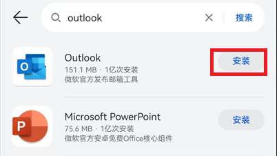 在手机应用市场中搜索Outlook进行下载和安装。如应用市场中没有,也可以到官网进行下载。下载链接