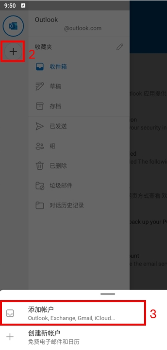 在 Outlook for Android 中设置另一个电子邮件帐户(软件中已经添加过一个或多个电子邮件帐户)