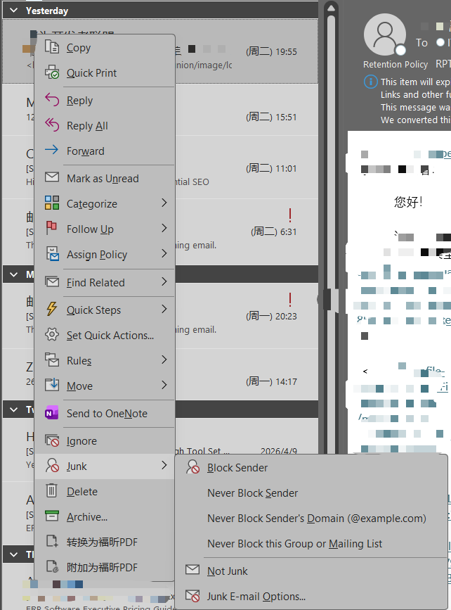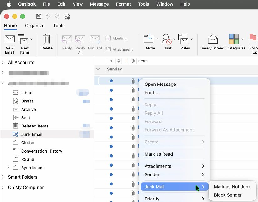 - In any mail folder, go to the Junk option in the right-click menu of the message, then select Block Sender.