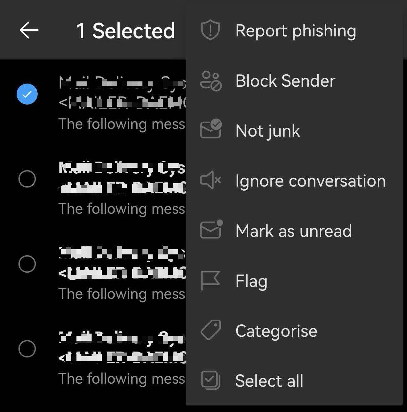 - In the Junk Email folder, select and long-press the message, then tap the three-dots menu button at the top.