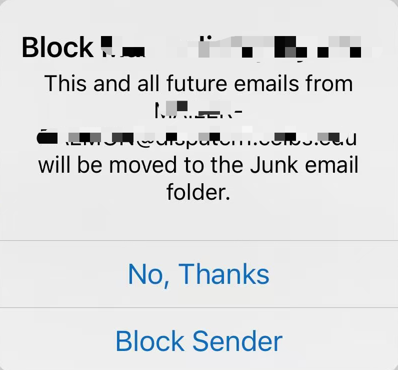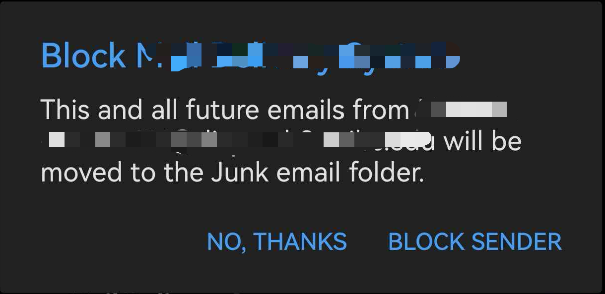 - In the pop-up window, tap Block Sender. The message will be moved to the Junk Email folder.