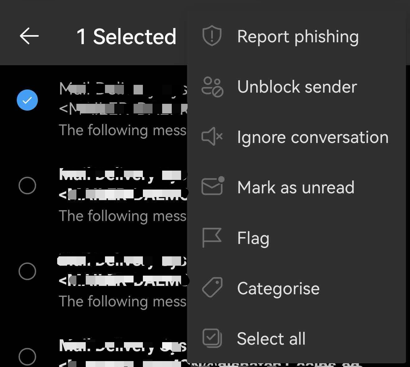 - (If you have blocked this sender on this device before, the Unblock sender option will appear here.) Select Unblock sender in the menu. The message will be moved back to the Inbox folder.