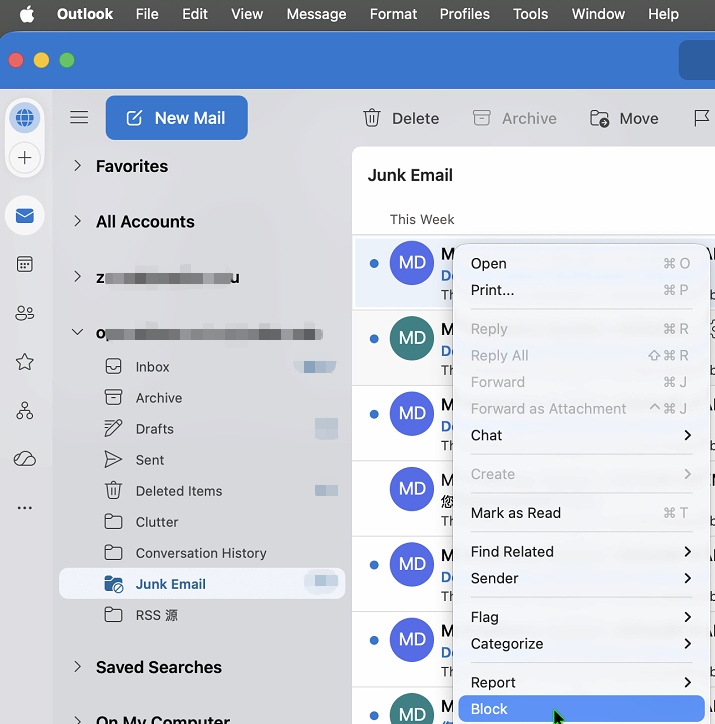 - In any email folder, select Block from the right-click menu.