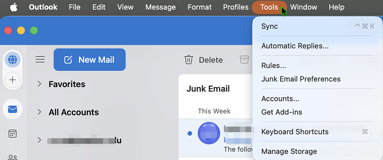- From the top menu bar, select Tools > Junk Email Preferences.