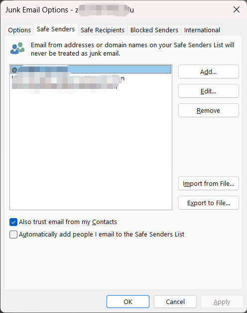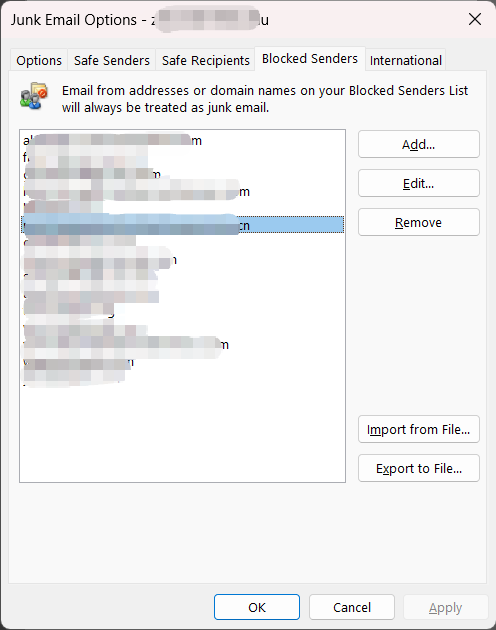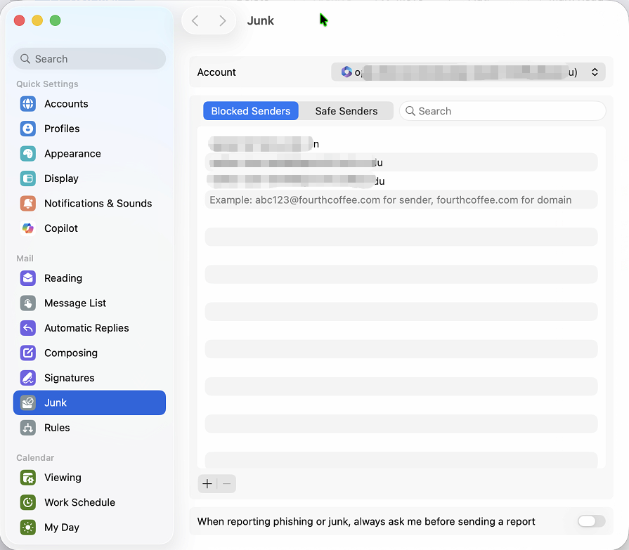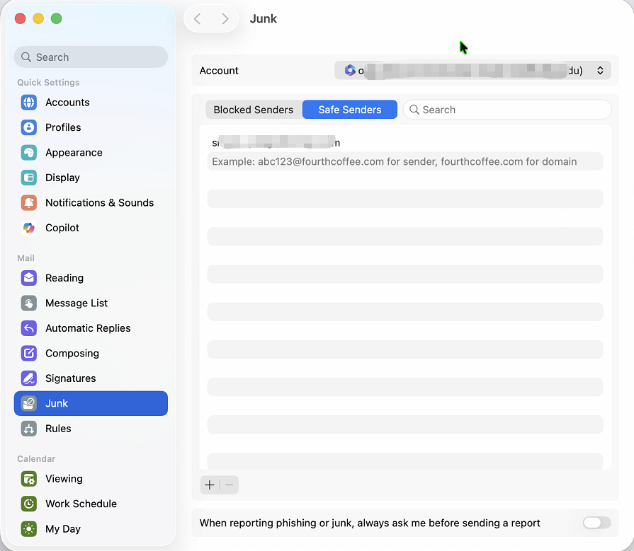 Note: If you use the built-in Mail app on a Mac to send and receive emails, managing the whitelist (Safe Senders) and blacklist (Blocked Senders) is currently unavailable. To use these functions, please set them up via Outlook on the web.