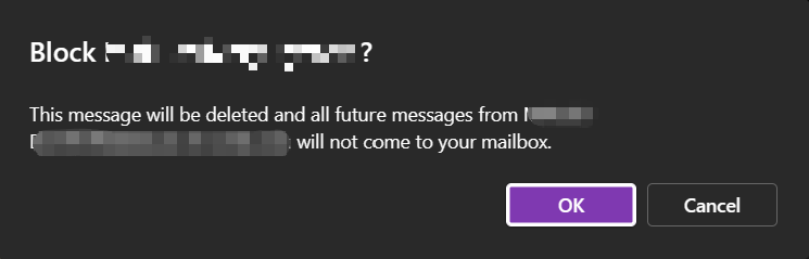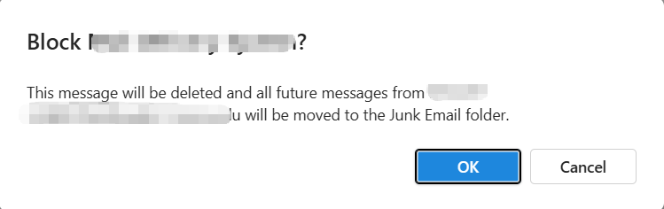 - In the pop-up window asking "Block xxx?", click OK. This message will be deleted, and the sender will be added to the blacklist (Blocked Senders list).