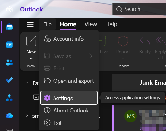 - In the upper-left corner of Outlook, select Home > Settings.