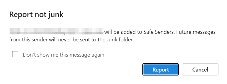 - In the Report Not Junk pop-up window, click Report. This message will be moved back to the Inbox folder, and the sender will be added to the whitelist (Safe Senders List).