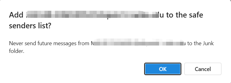 - In the pop-up window, click OK, the sender will be added to the whitelist (Safe Senders List).