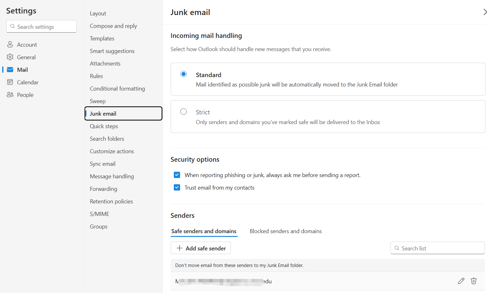 - In the left menu, select Mail > Junk email. In the Safe senders and domains list, select the email address you want to remove, click the Remove🗑️icon, and then click Save to finish.