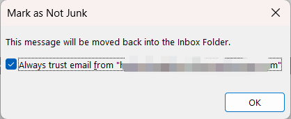 In the Mark as Not Junk pop-up window, check the option Always trust e-mail from "xxx@xxx", then click OK. The message will be moved back to the Inbox folder.