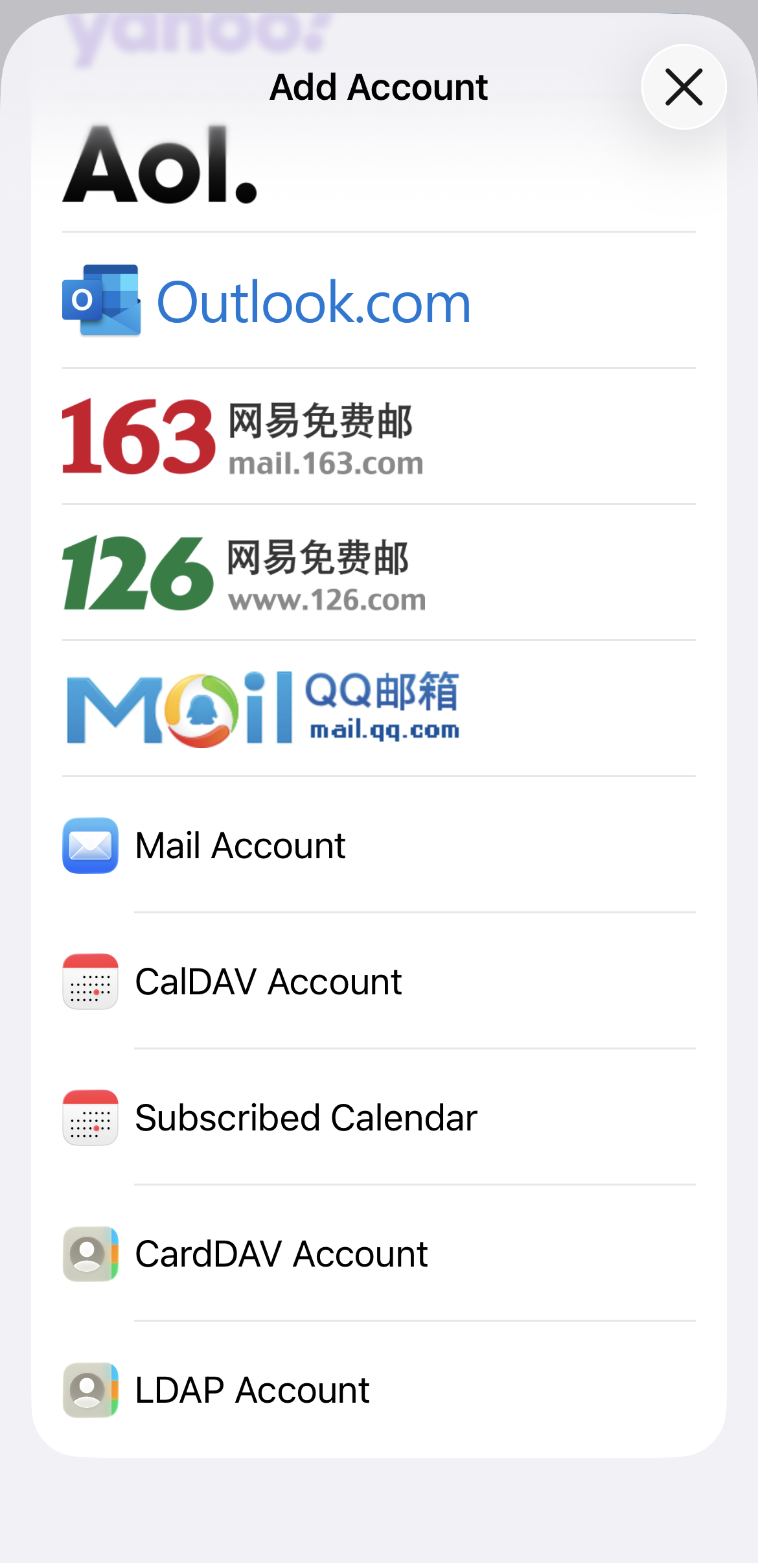 - In the pop-up window, scroll down and select Mail Account.
