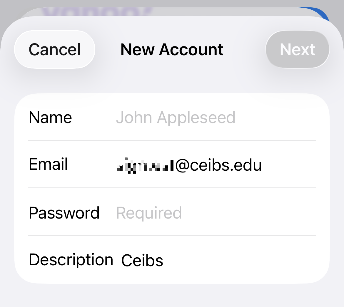 - Enter the display name of your CEIBS alumni email address in the Name field, enter the password for your CEIBS alumni email address in the 'Password' field, enter a description to help you identify which email account this is (e.g. CEIBS), and tap Next.
