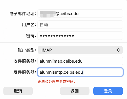 - 输入名称(比如CEIBS Alumni),电子邮件地址 区域输入 中欧校友邮箱地址,输入 密码 后选择 登录。