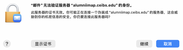 - 如果收到提示 ”邮件“无法验证服务器”alumniimap.ceibs.edu"的身份,请选择 继续。