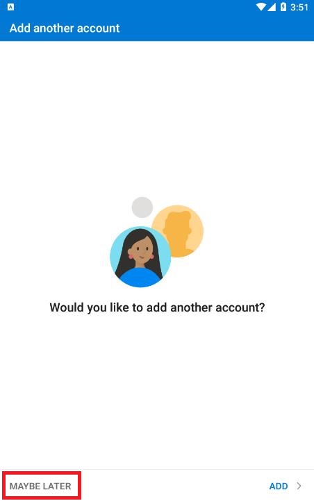 - After successful verification, you will be prompted to add another account; select MAYBE LATER to complete.