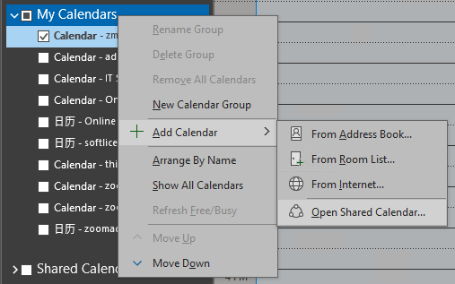 - In the left pane, right-click My Calendars, click Add Calendar, select Open Shared Calendar... from the menu.