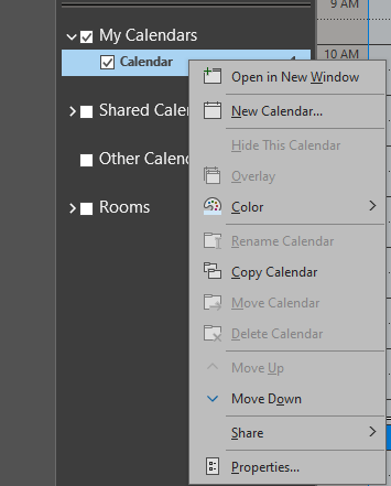 - Right-click your calendar under My Calendars, then select Properties from the menu.
