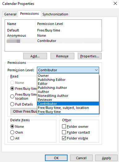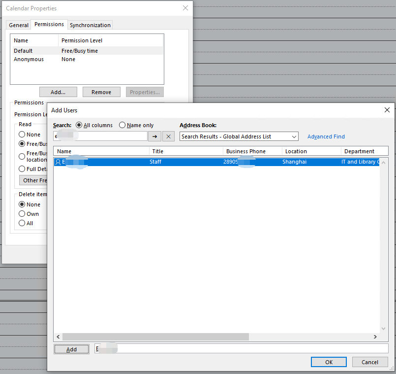 - In the Calendar Properties window, go to the Permissions tab, click Add… to select users you want to share with.