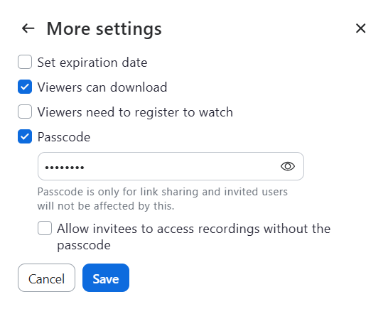 - Adjust sharing settings (e.g., set a passcode, expiration date, download permission, etc.), then select Save.